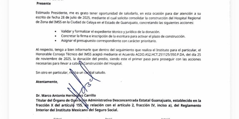 Señaló que derivado de los esfuerzos conjuntos realizados entre el Gobierno y el sector productivo del municipio, así como de la reunión sostenida en el mes de junio de 2025 y del oficio enviado en julio del mismo año, se ha recibido respuesta formal por parte del Instituto Mexicano del Seguro Social.