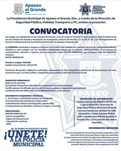 Apaseo el Grande, Gto., a 23 de julio de 2025.- La Dirección de Seguridad Pública de Apaseo el Grande, lanzó una convocatoria para ingresar a más Policías Municipales a la corporación.