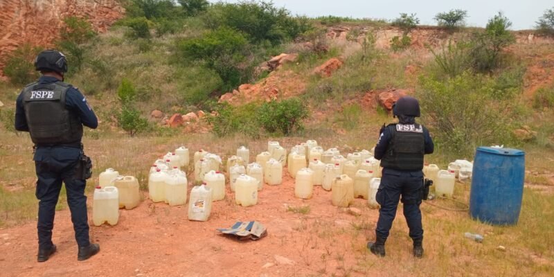 El hallazgo se realizó durante un operativo de búsqueda y recuperación de vehículos robados, sobre un camino de terracería que conduce a la comunidad El Rocillito, en una zona cerril. En el lugar, el personal operativo localizó varias garrafas con líquido transparente con olor similar a gasolina, además de una motocicleta.