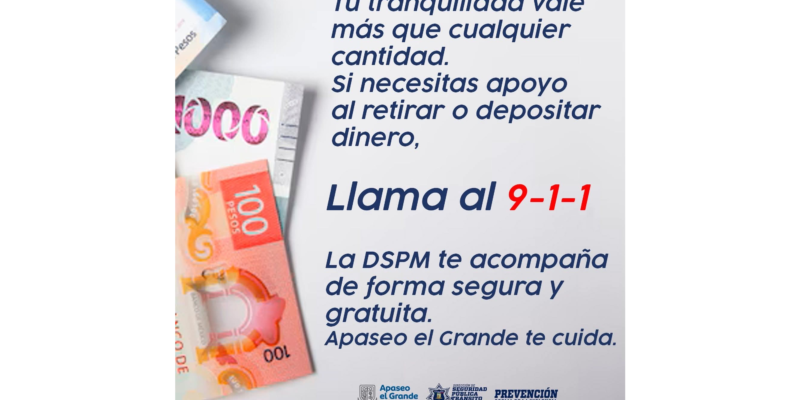 Apaseo el Grande, Gto., a 15 de diciembre de 2025.– Con el objetivo de brindar mayor seguridad a la ciudadanía durante la presente temporada de pagos de nómina y aguinaldos, la Dirección de Seguridad Pública Municipal puso a disposición el servicio de acompañamiento policial gratuito para quienes realicen movimientos importantes de dinero.