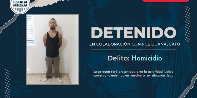 El individuo fue capturado el 31 de diciembre en territorio queretano por agentes de la Policía de Investigación de la FGJQ, quienes cumplimentaron una orden de aprehensión emitida por las autoridades de Guanajuato. La identidad del detenido no fue revelada.