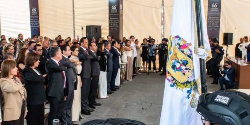 Durante la ceremonia realizada en la explanada del Jardín Principal, el Alcalde recibió a la gobernadora Libia Dennise García Muñoz Ledo, a la presidenta del Congreso del Estado Martha Edith Moreno Valencia y a la magistrada presidenta del Supremo Tribunal de Justicia Alma Delia Camacho Patlán, quienes participaron en la sesión solemne que recordó el decreto del 8 de marzo de 1826, mediante el cual la entonces Villa de San Miguel el Grande fue elevada a la categoría de Ciudad y adoptó el nombre de San Miguel de Allende, en honor al insurgente Ignacio Allende.