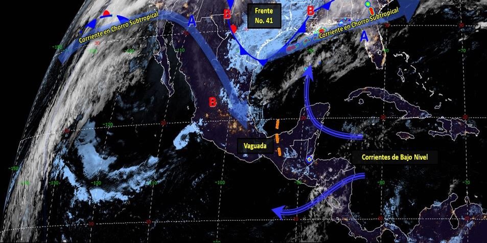 De acuerdo al reporte hidrometeorológico de la Comisión Nacional del Agua (CONAGUA) el frente fríonúmero 41 se extiende por el norte del país einteracciona con aire cálido y húmedo del Golfo de México, lo que propicia lluvias con tormenta y vientos fuertes en Coahuila, Nuevo León y Tamaulipas. Vaguada en el sureste de México favorece lluvias y chubascos sobre Puebla, Veracruz, Oaxaca y Chiapas.Además, tiempo seco y caluroso se mantiene en el resto del territorio nacional.