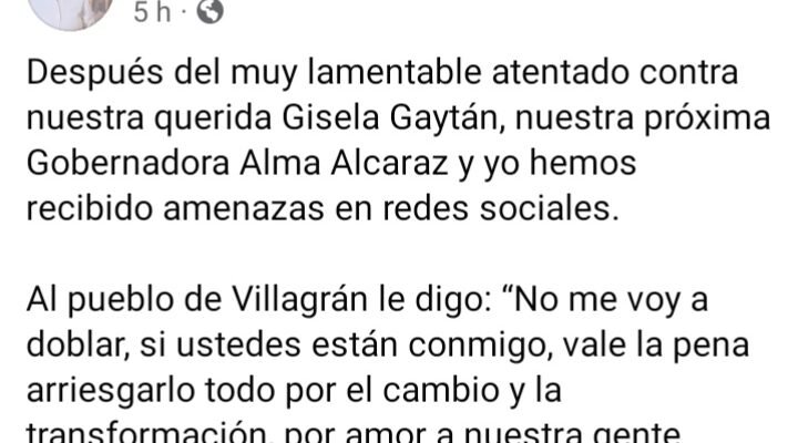 Villagrán, Gto. Abril 2.- La candidata de morena a la presidencia municipal, Cinthia Teniente, anunció la suspensión de actividades de campaña hoy, por el ataque y muerte de Gisela Gaytán, pero también, según denunció, porque ya recibió amenazas en las redes sociales.