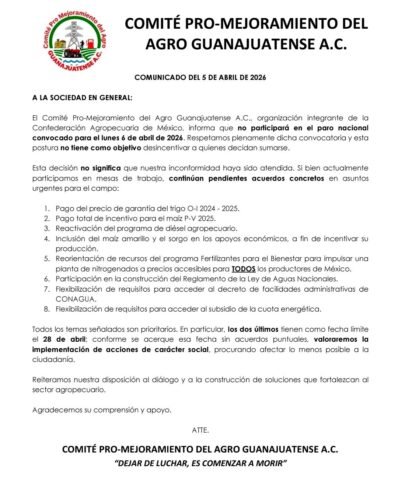 El comité pro mejoramiento del agro guanajuatense a través de un comunicado dio a conocer que no participarán en el paro nacional que se espera para este lunes.