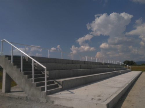 A un costado, se construyeron las gradas para los asistentes, y aunque el proyecto no lo contemplaba, con las economías generadas en la obra se inició la edificación de los módulos sanitarios, mismos que quedarán concluidos en la siguiente etapa de construcción de la Unidad.