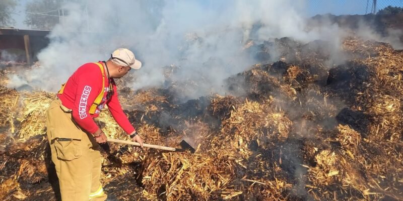Salvatierra, Gto.- La noche del domingo 29 de diciembre, un incendio consumió aproximadamente 2,500 pacas de rastrojo en la comunidad de San Miguel Emenguaro. El siniestro fue atendido por Protección Civil, en coordinación con el H. Cuerpo de Bomberos y personal del Sistema Municipal de Agua Potable y Alcantarillado de Salvatierra (SMAPAS).