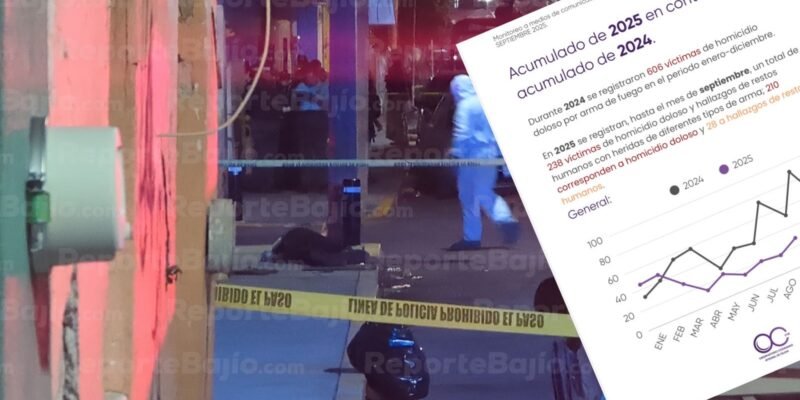 Celaya, Gto; El municipio cerró septiembre de 2025 con 28 víctimas de homicidio doloso y hallazgos de restos humanos, lo que representa una baja del 46% en comparación con el mismo mes del año anterior, cuando se contabilizaron 52 casos, así lo reportó el Observatorio Ciudadano Integral de Celaya (OCC).