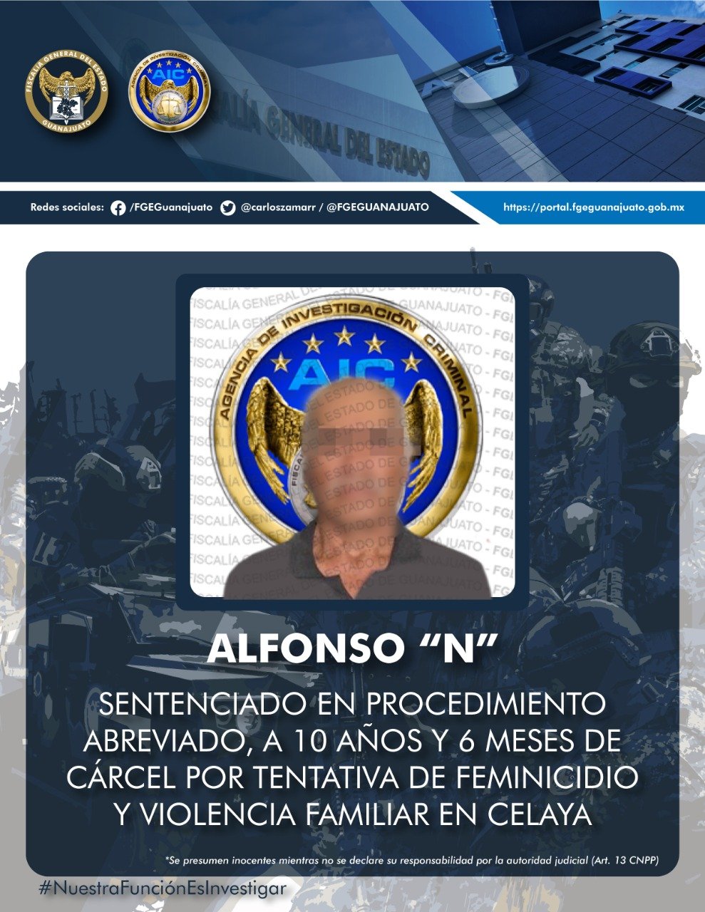 Celaya, Gto., 12 de enero de 2023.- En procedimiento abreviado, la Fiscalía General del Estado obtuvo un fallo judicial de 10 años y 6 meses de cárcel por tentativa de feminicidio y violencia familiar, en contra de ALFONSO “N”, quien deberá cumplir un tratamiento psicoterapéutico integral, durante su tiempo en prisión.