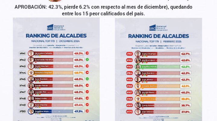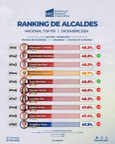 Celaya, Gto. 5 de marzo. De acuerdo a la encuesta realizada por STATISCAL RESEARCH CORPORATION, Nacional Top 179, realizada en México, del 24 al 27 de febrero del 2025, con el objetivo recopilar datos cuantitativos en los municipios evaluados, para obtener el nivel de aprobación de sus alcaldes, se obtuvieron los siguientes resultados: