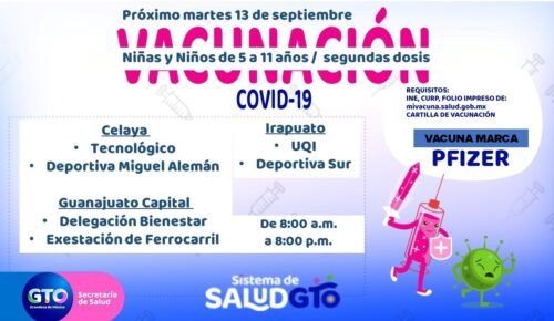 Guanajuato, Gto. 2022.- Este martes el sistema de salud GTO iniciará la vacunación de segundas dosis para menores de 5 a 11 años, son vacunas de la marca Pfizer dijo el secretario de salud, Daniel Alberto Díaz Martínez.