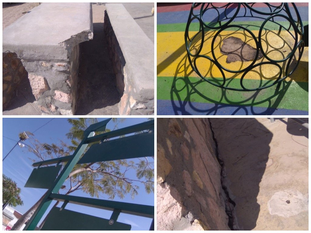 La obra, efectuada por la empresa Constructora Urc S. A. de C. V., acorde a documentación entregada a la regidora por la Dirección de Obras Públicas, presenta grietas en toda la construcción, distancia excesiva entre los bloques del suelo, desnivel de más de 10 centímetros entre guarnición y suelo, así como despostillamiento grave del tartán y de las bancas de concreto.