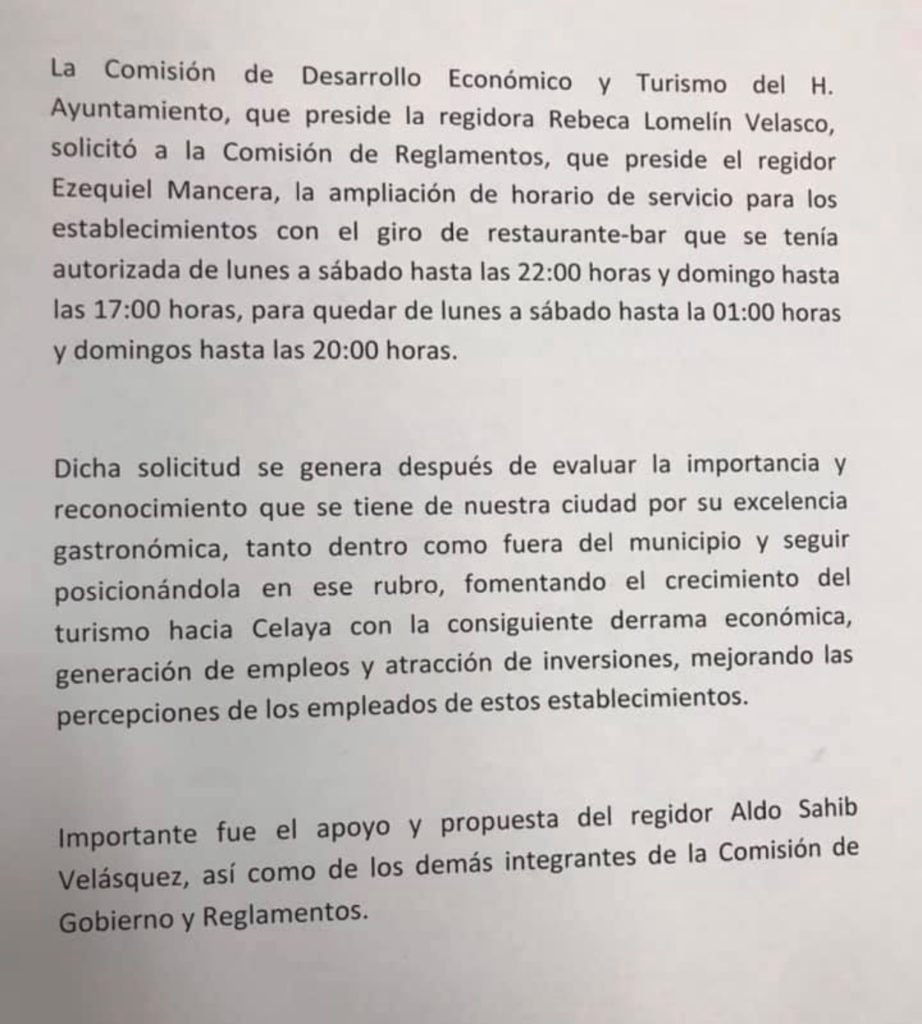 En el escrito se explica que “dicha solicitud se genera después de evaluar la importancia y reconocimiento que se tiene de nuestra ciudad por su excelencia gastronómica, tanto dentro como fuera del municipio y seguir posicionándola en ese rubro, fomentando el crecimiento del turismo hacia Celaya con la consiguiente derrama económica, generación de empleos, y atracción de inversiones mejorando las percepciones de los empleados de estos establecimientos”.