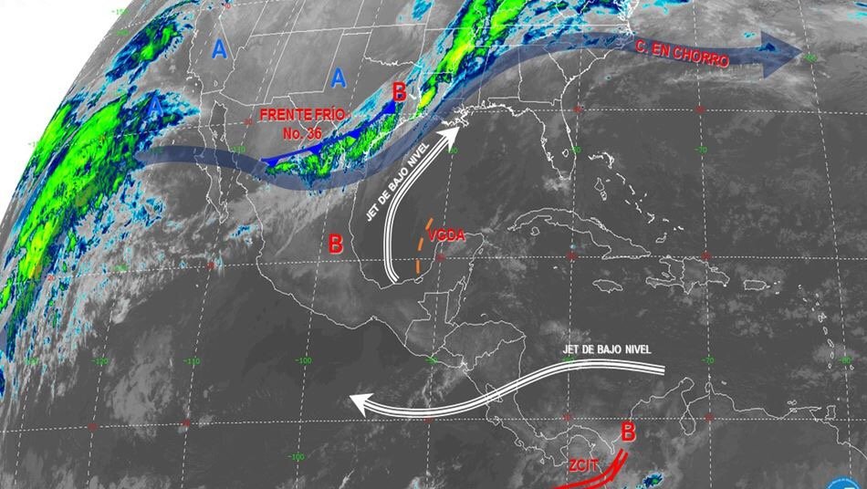 De acuerdo al reporte hidrometeorológico de la Comisión Nacional del Agua (CONAGUA) en la región central del país el frente frío número 36 se mueve al noreste y oriente, genera tormentas fuertes en oriente y centro del país. La masa de aire polar que lo impulsa propicia descenso de temperatura en la mesa del norte y central, bancos de niebla en noreste y oriente. Un evento “Norte” arrastra vientos fuertes y rachas violentas en Costas de Veracruz, Istmo y Golfo de Tehuantepec.