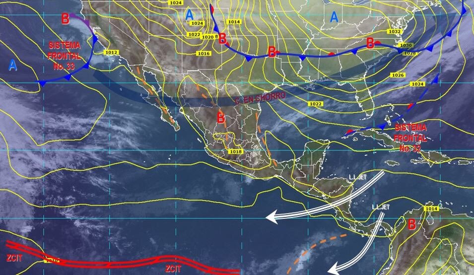 De acuerdo al reporte hidrometeorológico de la Comisión Nacional del Agua (CONAGUA) una masa de aire frío continúa afectando con bancos de niebla al noreste y oriente del país. Por la tarde ingresa el frente frío número 33 al noroeste asociado a corriente de chorro, lo que propicia descenso de temperatura. Se esperan vientos y rachas muy fuertes en Baja California y Sonora, también caída de aguanieve en áreas altas y serranas. En el resto del país continúa la presencia de vientos.