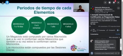 Los elementos de la planeación deportiva son microciclo (7 a 10 días), mesociclo (3 a 6 semanas), macrociclo (1 año) y megaciclo (4 años). Las sesiones de entrenamiento son la parte más pequeña de la preparación física, las cuales deben ser planificadas con un objetivo y se recomienda dividirlo por fases: introducción del entrenamiento, calentamiento general, calentamiento especial, cumplimiento de los objetivos y vuelta a la calma o enfriamiento, fueron otros de los temas tratados en esta certificación.