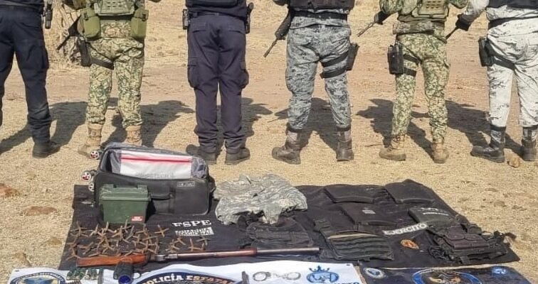 En el lugar se aseguraron dos armas de fuego —una pistola y una escopeta—, 16 cargadores de distintos calibres, 166 cartuchos útiles, tres chalecos tácticos portaplacas con cuatro placas balísticas, una mira óptica y 29 artefactos metálicos conocidos como “ponchallantas”, además de otros accesorios utilizados para el manejo de armamento.